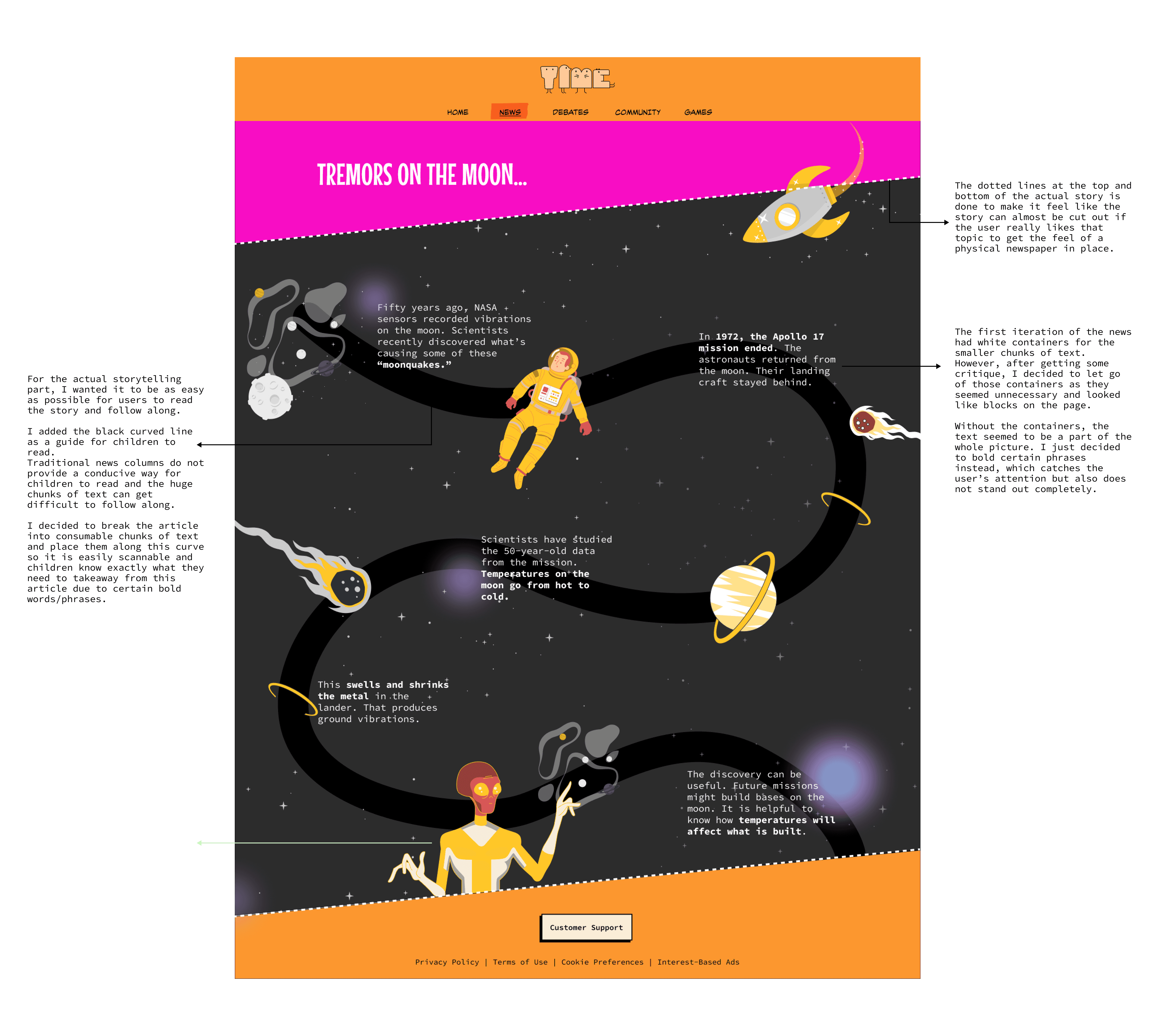 To connect with children’s imagination, I leaned into a comical, hand-drawn illustration style—something that felt more like a storybook than a news site. Each section was paired with playful graphics that matched its content: rockets and globes for world news, paint splashes for arts, and animals for science.