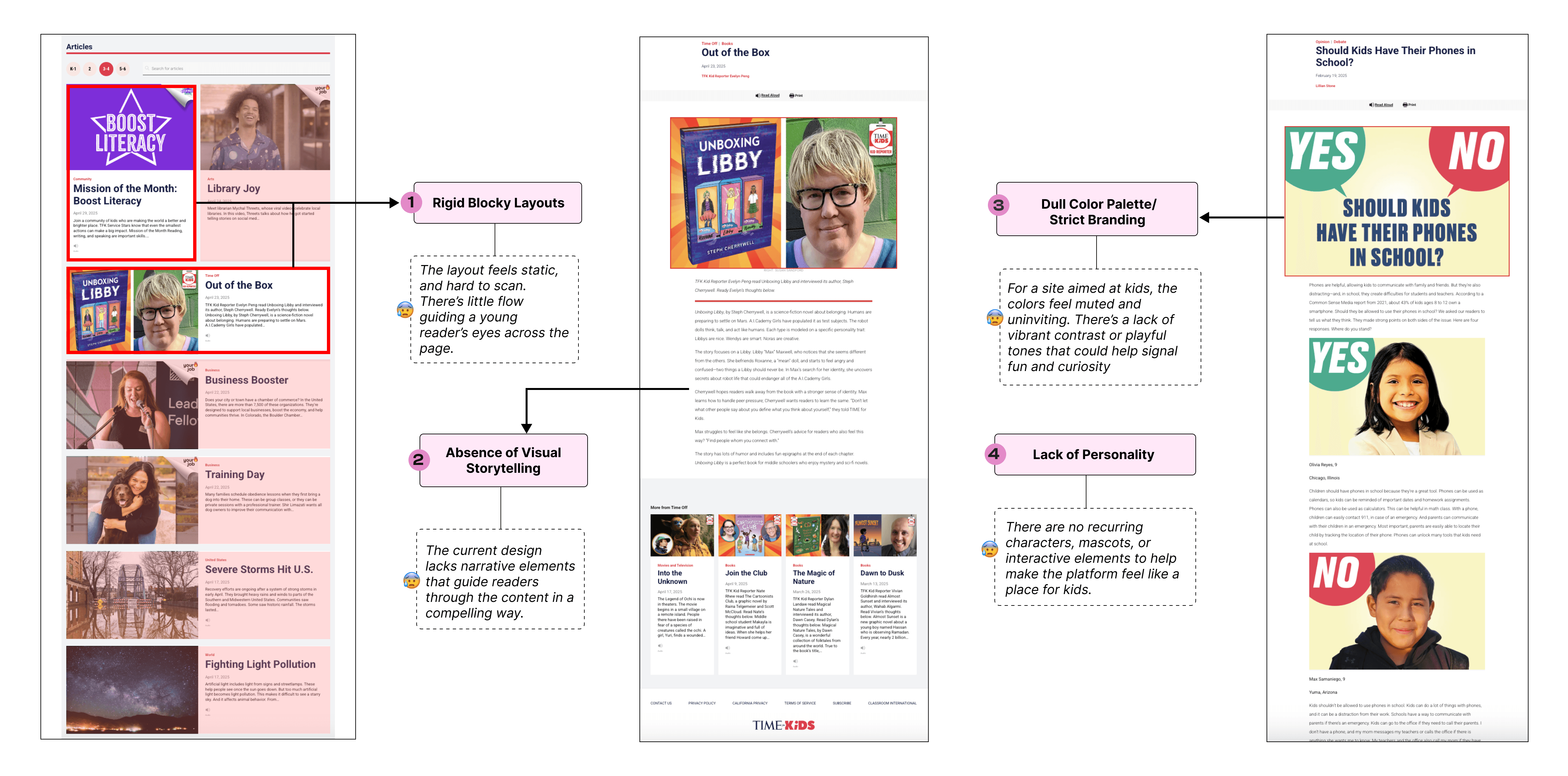 To explore this problem further, I began reviewing how real-world platforms present news to children today. That’s when I came across Time for Kids, a well-known kids’ news publication by Times News. While the content aimed to be simple and informative, the visual experience still felt rigid and uninspiring.