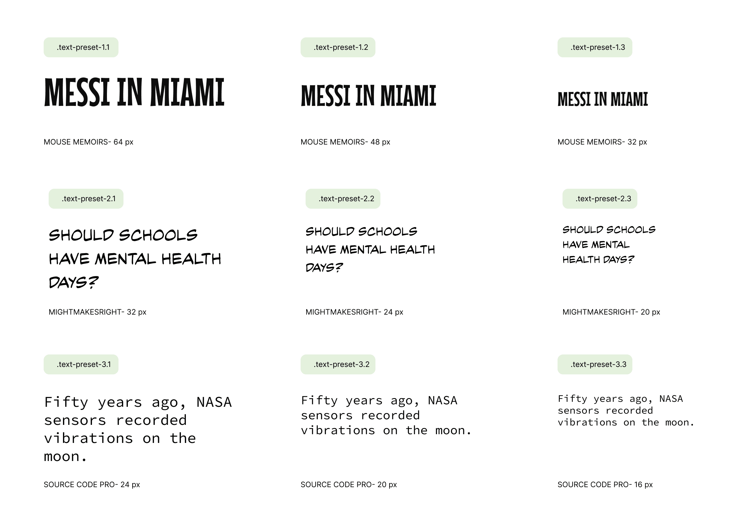 The final type system includes Mighty Makes Right for its hand-drawn, friendly character, Mouse Memoirs for bold, bouncy headlines, and Source Code Pro to give subtle structure and a gamified edge. Together, these fonts make the interface feel fun, expressive, and easy to read — ideal for keeping young readers engaged.